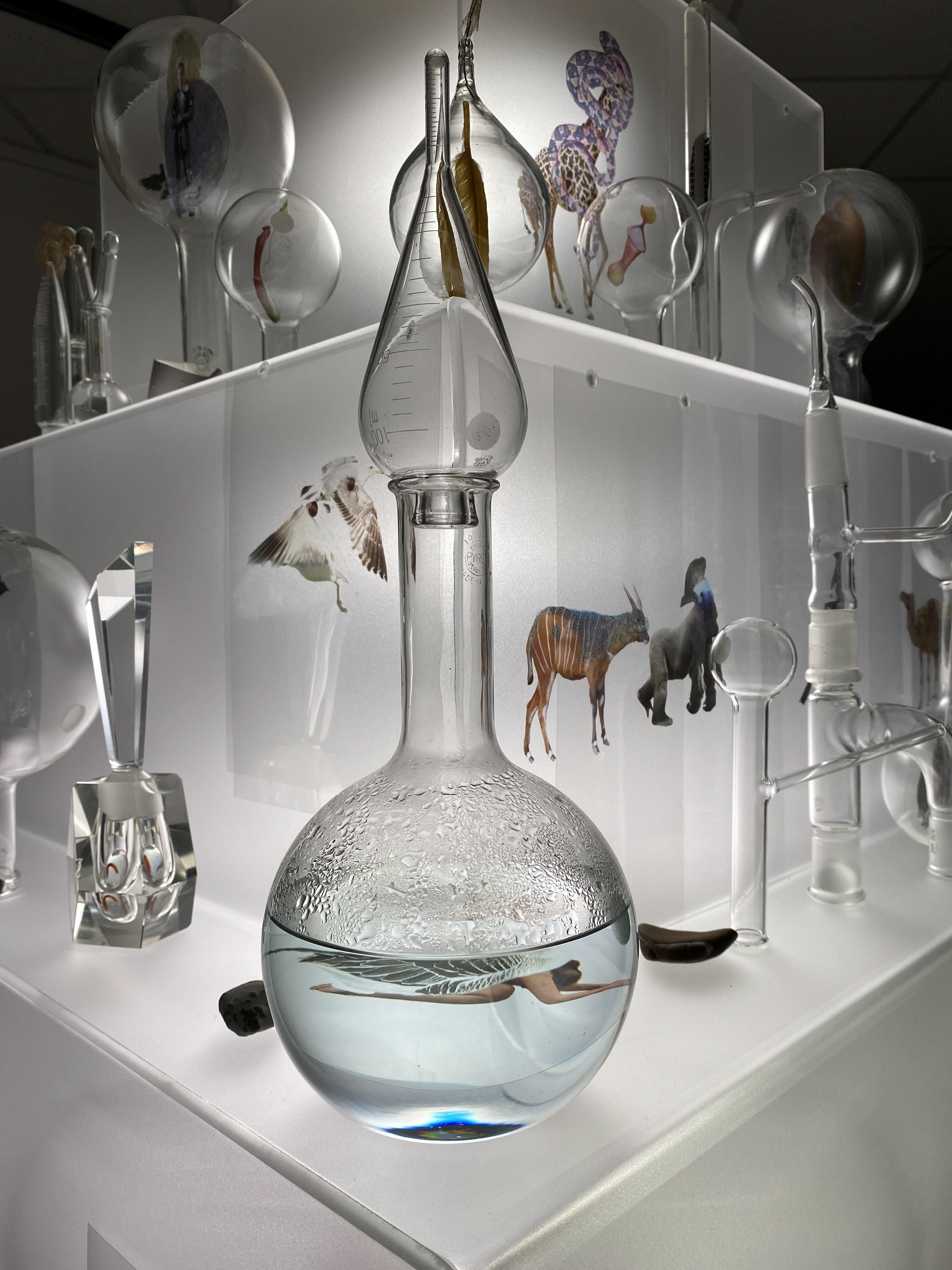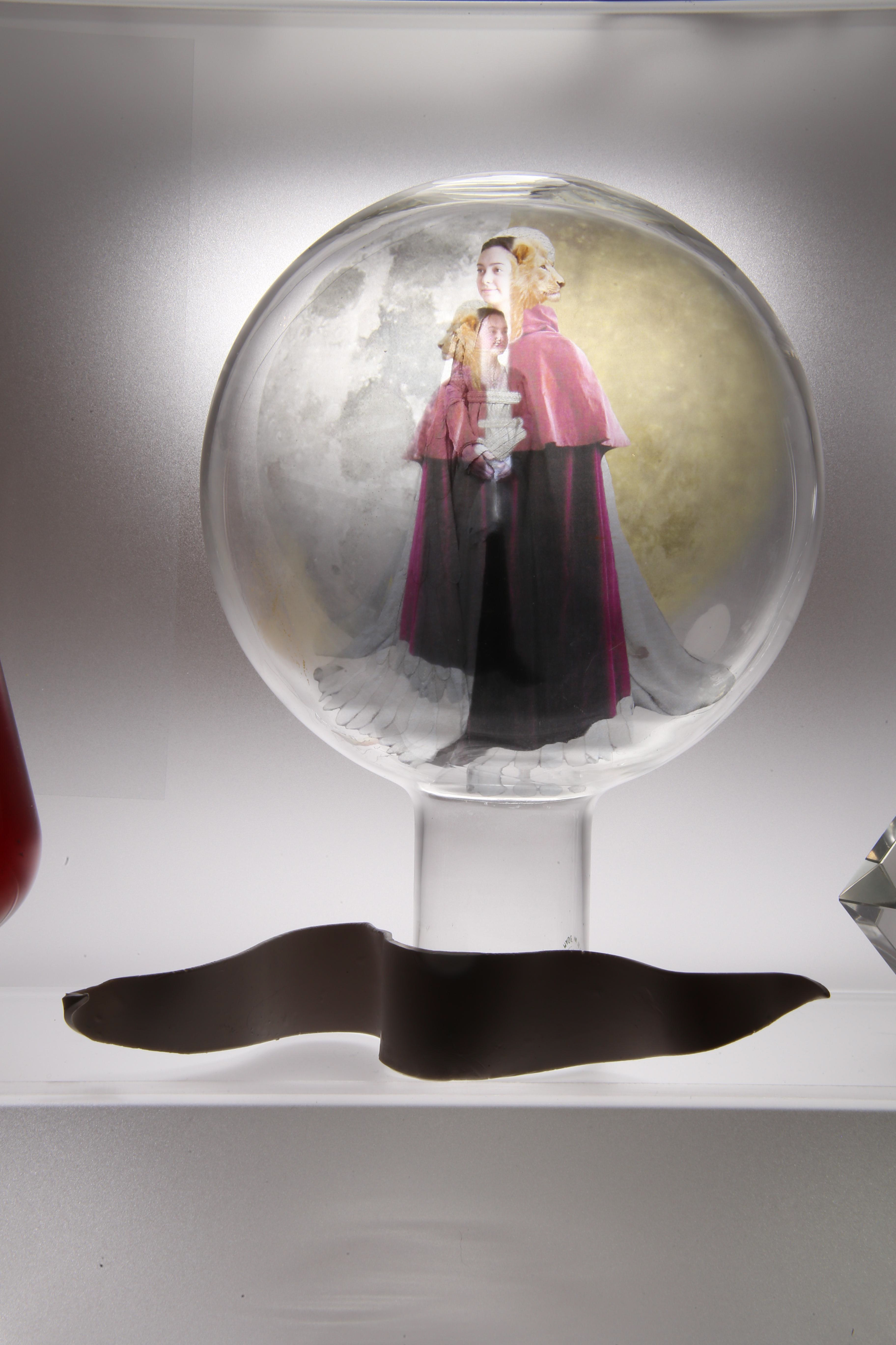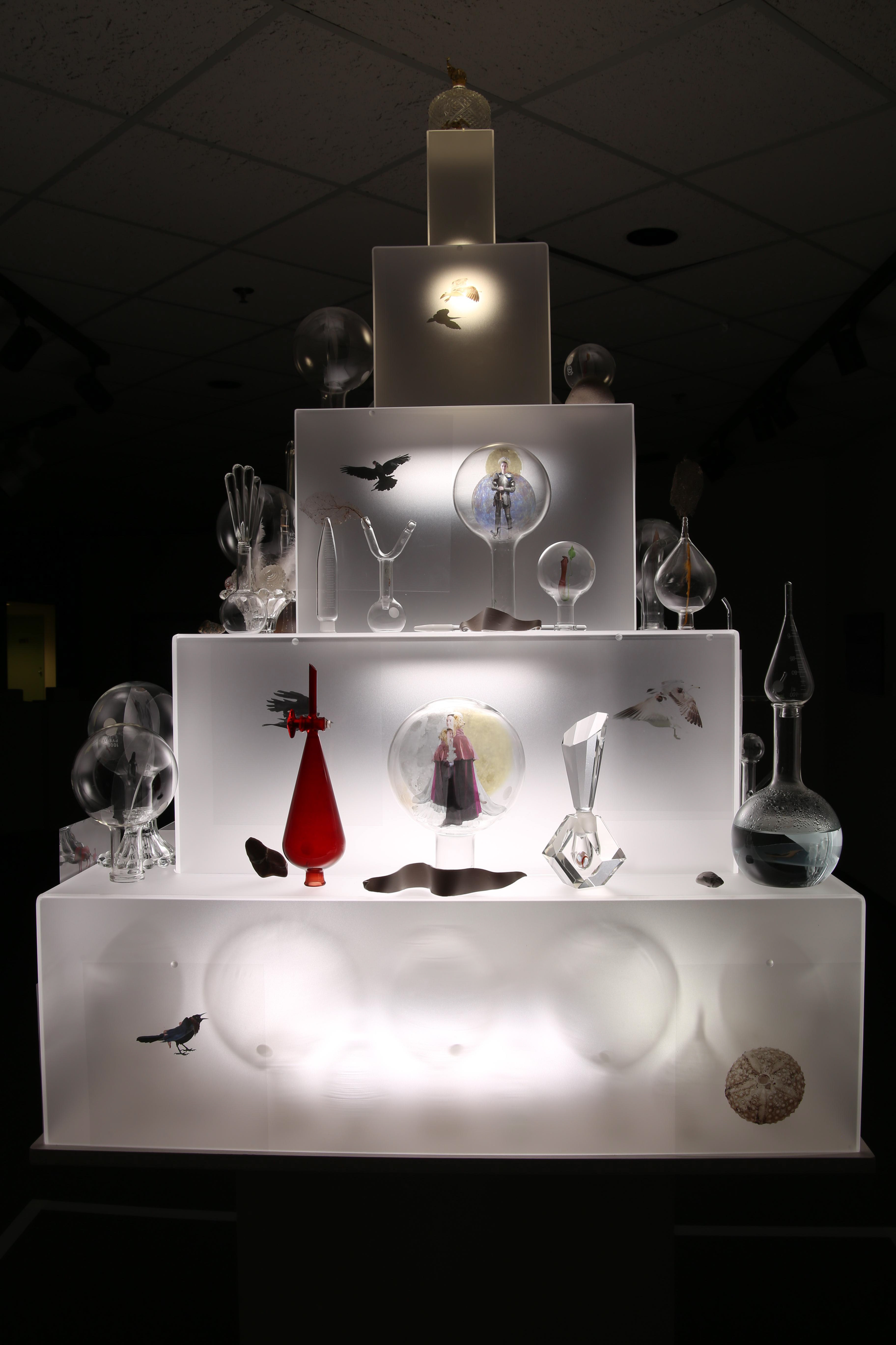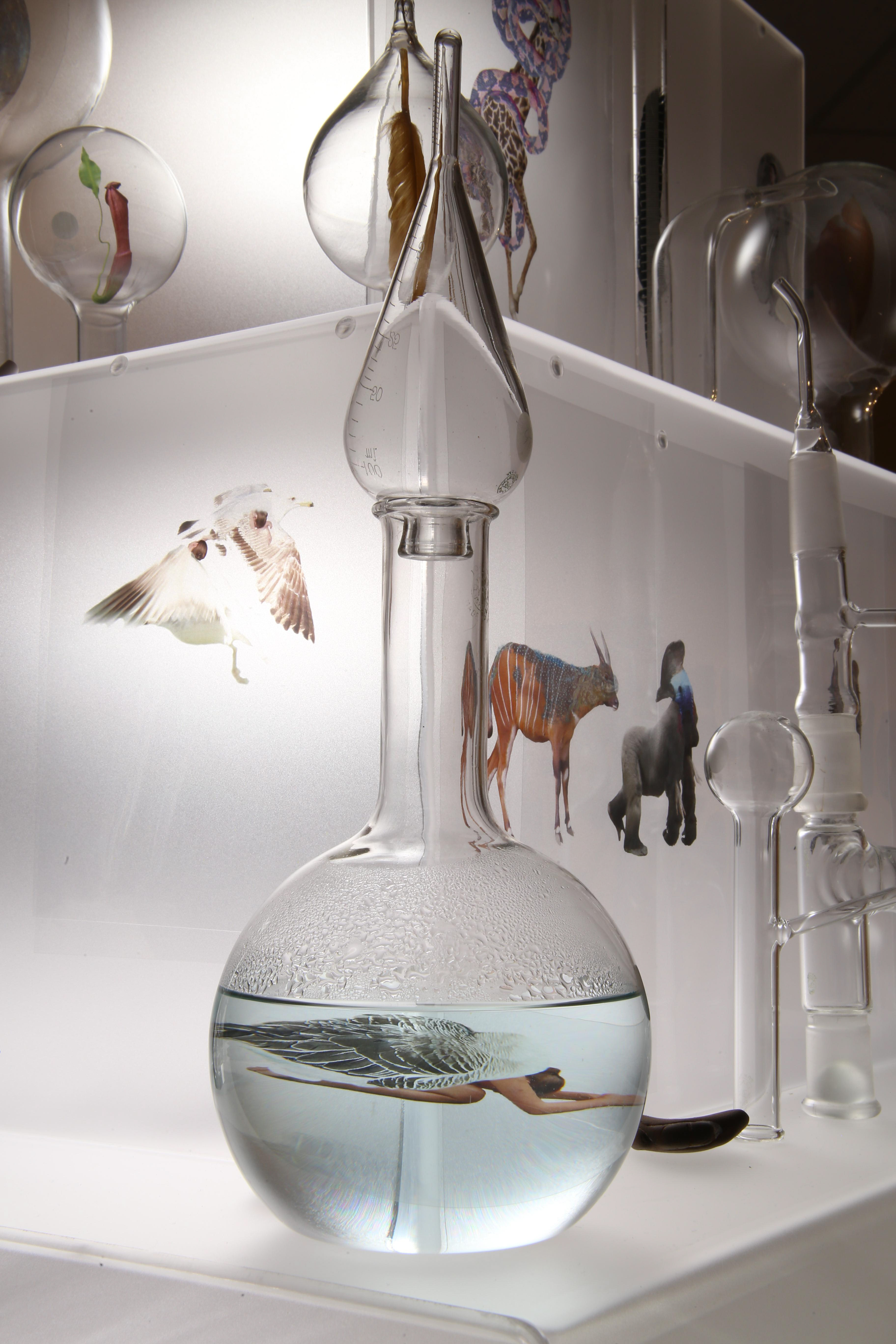 This project is the result of my study of the early Alchemists’ ideas and artwork. For it, I photographed my own subjects to transform to alchemical themes, and floated them in scientific glass on a backlit tower, telling their story.. Not every Alchemist’s goal was to turn lead into gold for personal fortune, there were also faithful Alchemists seeking personal transformation. Their belief was that through Alchemy, God’s revelations would teach them how to change their own base energy into the refined energy of the Holy Spirit. Alchemy was controversial so the transmutation process was kept secret and Alchemists used code, including images, to communicate. Some symbols were universal, like Sulphur: Sun/Lion/King, and Mercury: Wolf/Moon/Queen, but many were developed in isolation so very idiosyncratic. The Alchemists’ artwork reveals their intention, imagination, and dedication to truth through observation of the natural world, contributing to the dawn of chemistry. It was Alchemists’ revision of failed experiments that led to the modern scientific process. Most satisfying is that centuries later, in 1981, scientists sucessfuly transmuted lead to gold with a particle accelerator.