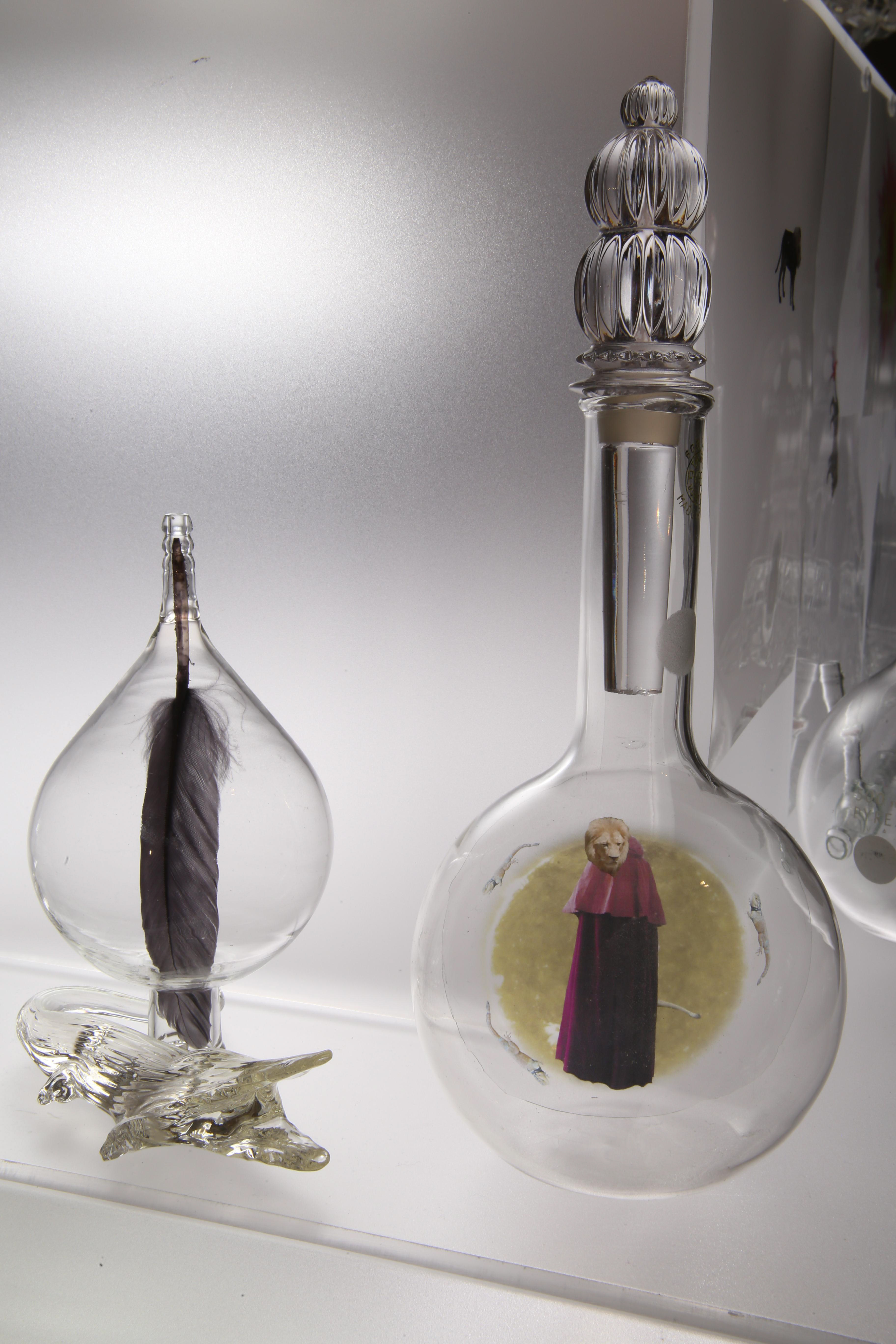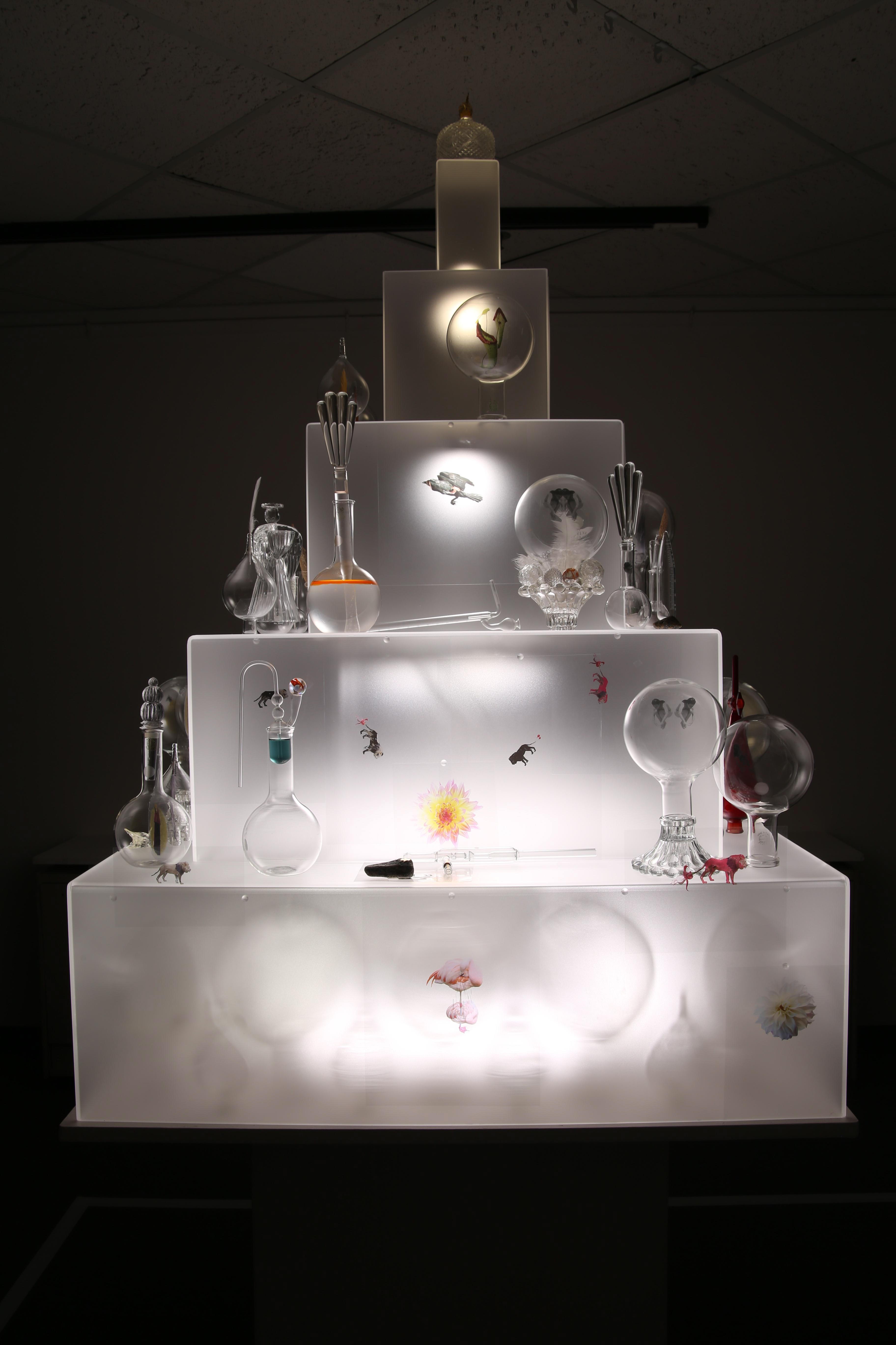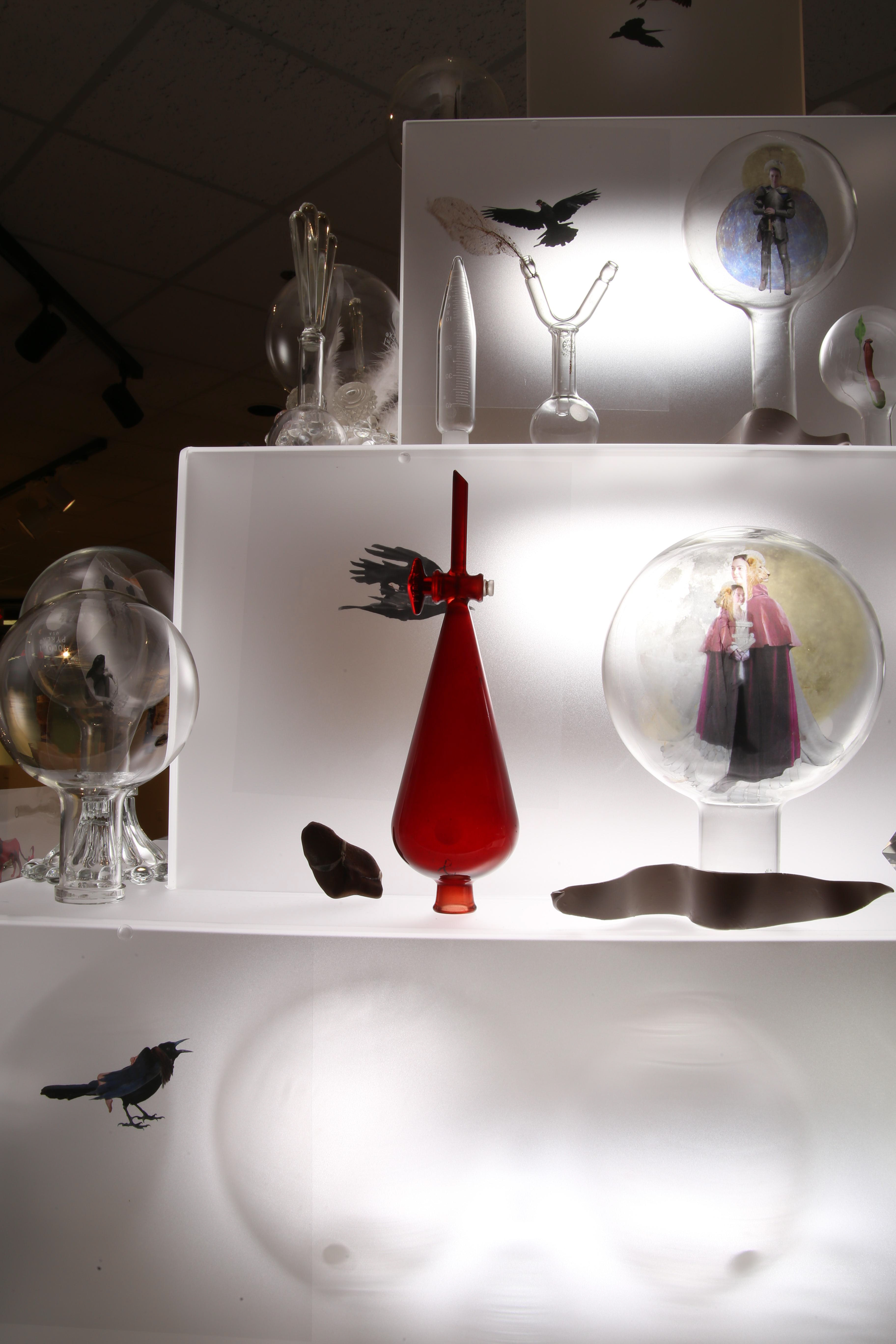 This project is the result of my study of the early Alchemists’ ideas and artwork. For it, I photographed my own subjects to transform to alchemical themes, and floated them in scientific glass on a backlit tower, telling their story.. Not every Alchemist’s goal was to turn lead into gold for personal fortune, there were also faithful Alchemists seeking personal transformation. Their belief was that through Alchemy, God’s revelations would teach them how to change their own base energy into the refined energy of the Holy Spirit. Alchemy was controversial so the transmutation process was kept secret and Alchemists used code, including images, to communicate. Some symbols were universal, like Sulphur: Sun/Lion/King, and Mercury: Wolf/Moon/Queen, but many were developed in isolation so very idiosyncratic. The Alchemists’ artwork reveals their intention, imagination, and dedication to truth through observation of the natural world, contributing to the dawn of chemistry. It was Alchemists’ revision of failed experiments that led to the modern scientific process. Most satisfying is that centuries later, in 1981, scientists sucessfuly transmuted lead to gold with a particle accelerator.