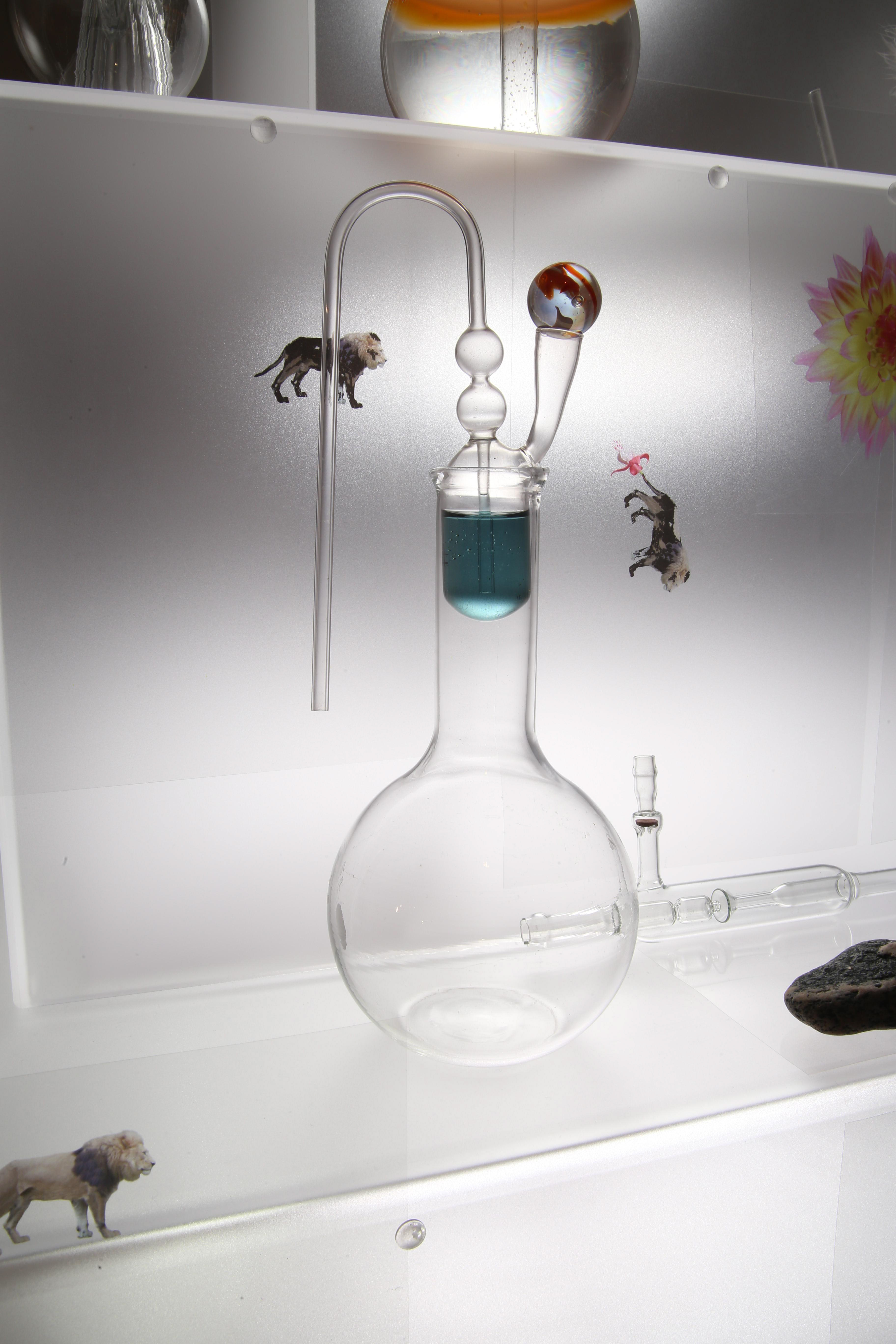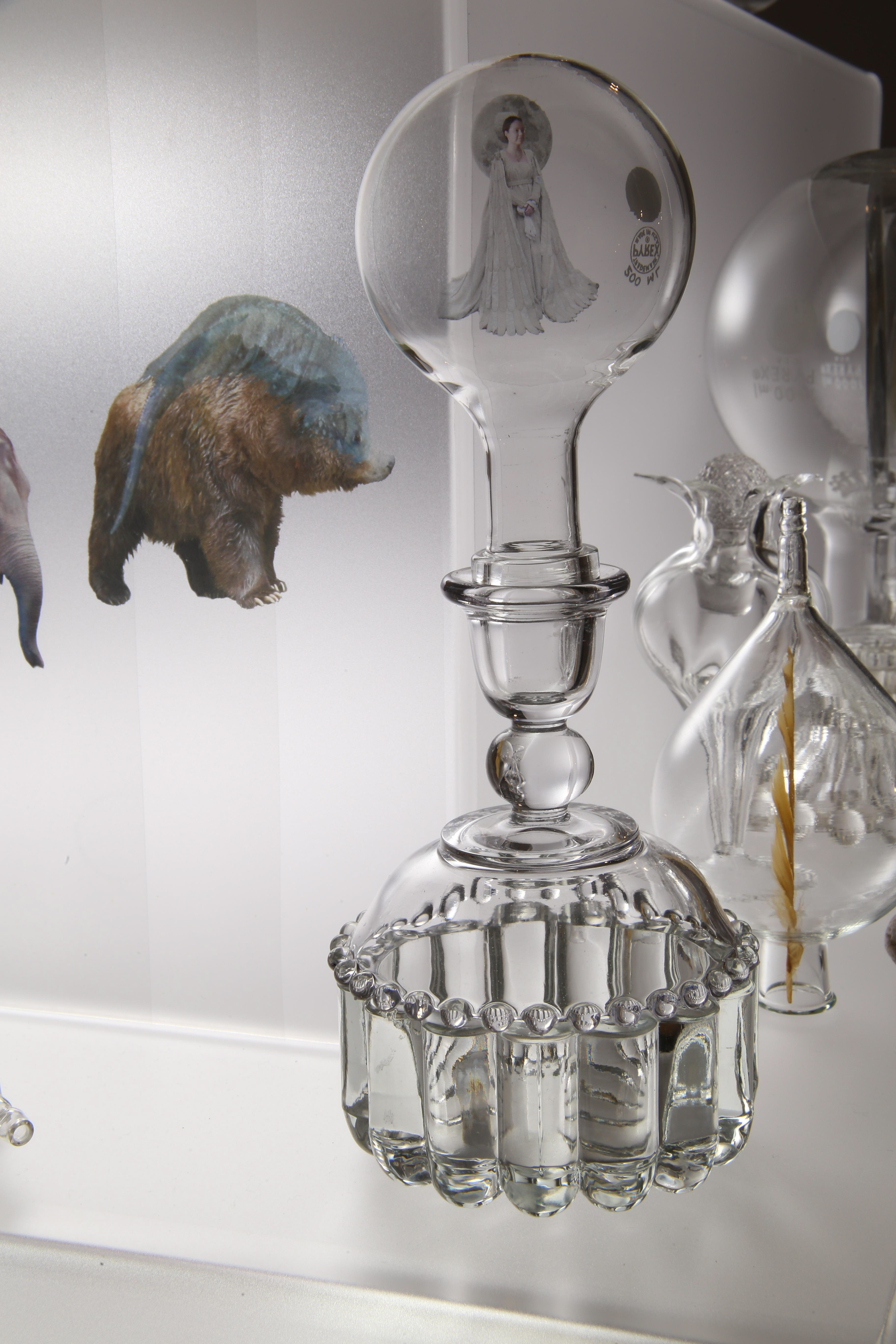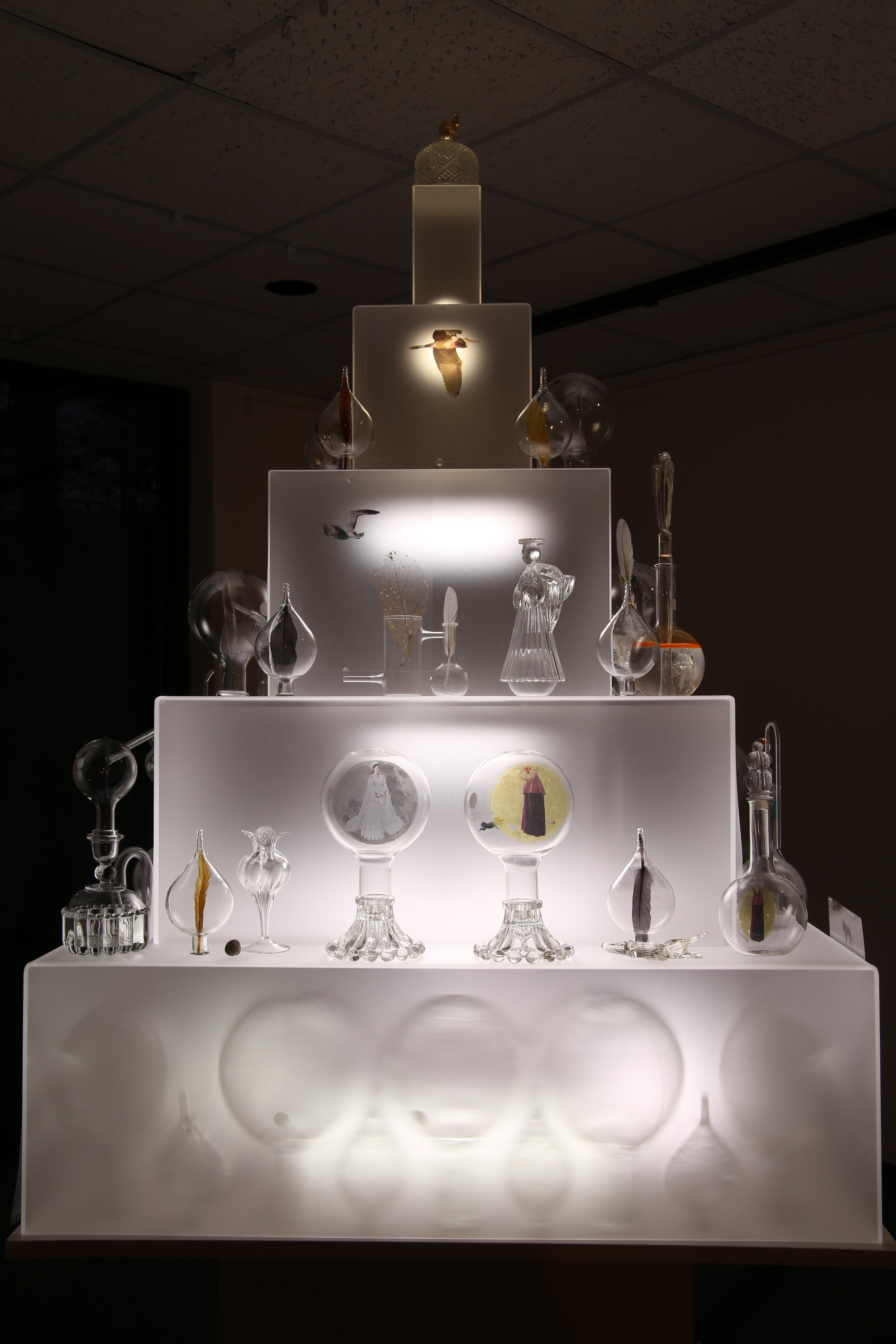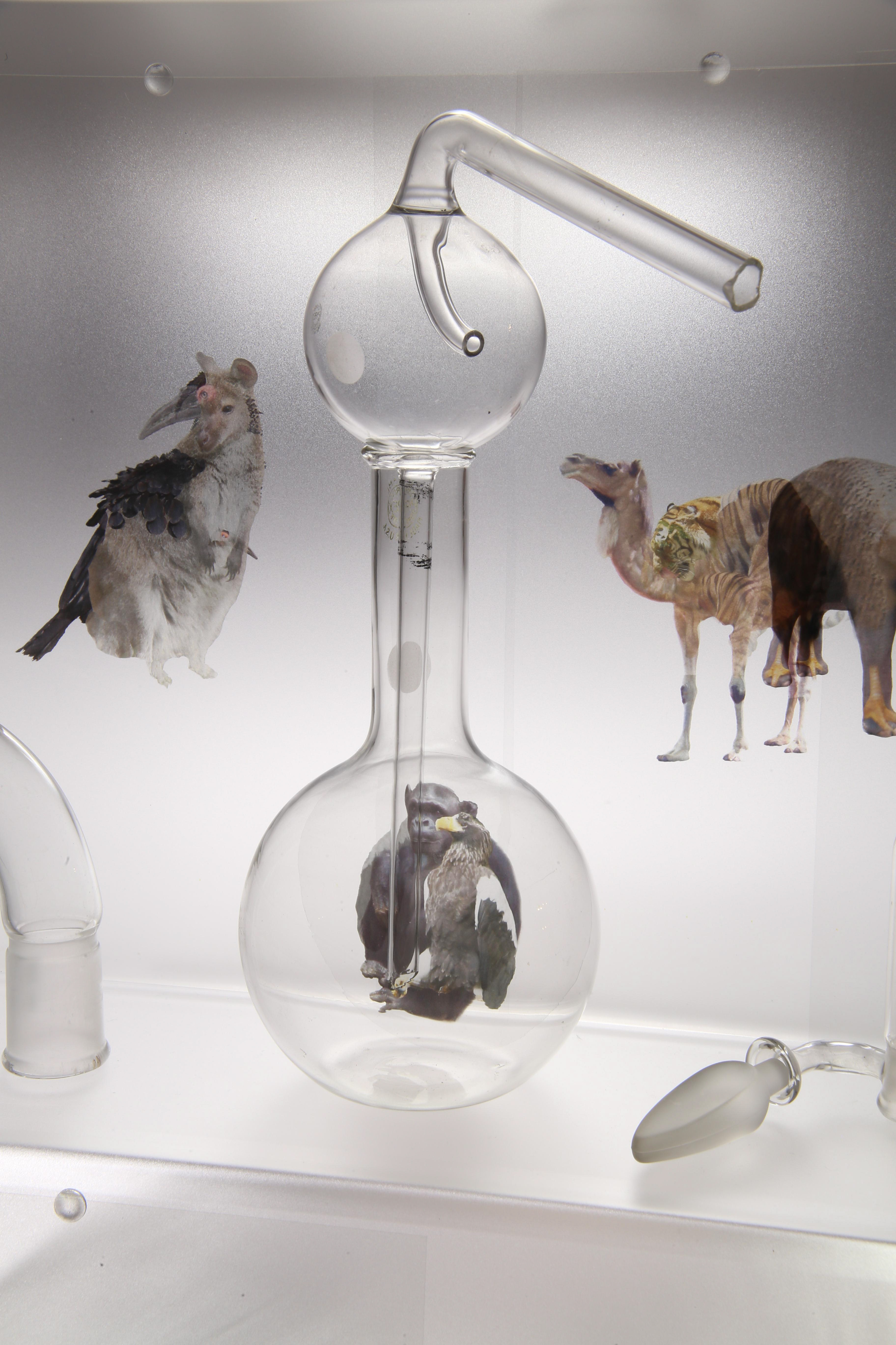 This project is the result of my study of the early Alchemists’ ideas and artwork. For it, I photographed my own subjects to transform to alchemical themes, and floated them in scientific glass on a backlit tower, telling their story.. Not every Alchemist’s goal was to turn lead into gold for personal fortune, there were also faithful Alchemists seeking personal transformation. Their belief was that through Alchemy, God’s revelations would teach them how to change their own base energy into the refined energy of the Holy Spirit. Alchemy was controversial so the transmutation process was kept secret and Alchemists used code, including images, to communicate. Some symbols were universal, like Sulphur: Sun/Lion/King, and Mercury: Wolf/Moon/Queen, but many were developed in isolation so very idiosyncratic. The Alchemists’ artwork reveals their intention, imagination, and dedication to truth through observation of the natural world, contributing to the dawn of chemistry. It was Alchemists’ revision of failed experiments that led to the modern scientific process. Most satisfying is that centuries later, in 1981, scientists sucessfuly transmuted lead to gold with a particle accelerator.